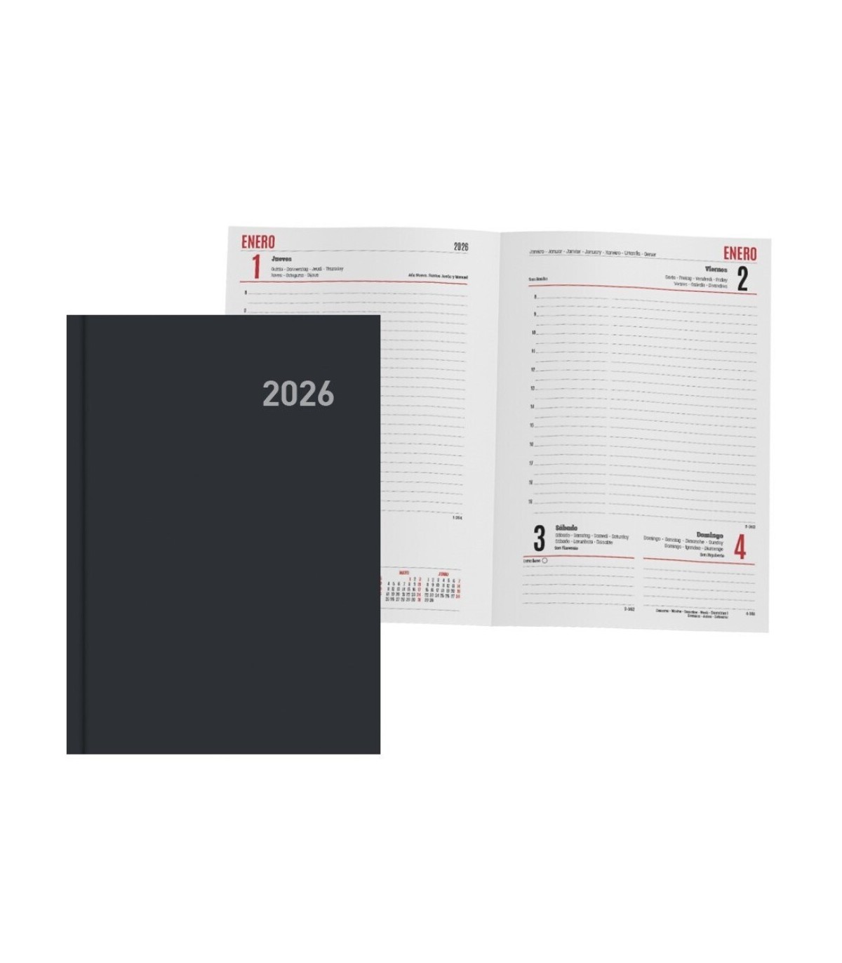 Ingraf Paris agenda anual. Cubierta rígida forrada. Interior con viernes, sábado y domingo en la misma página, impresa a dos colores en papel ecológico de 80 grs.