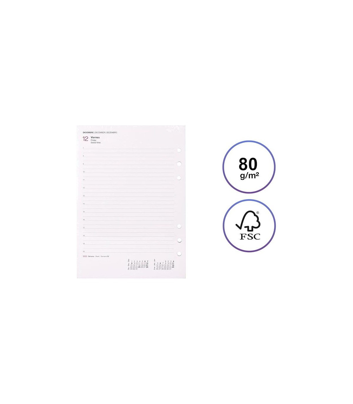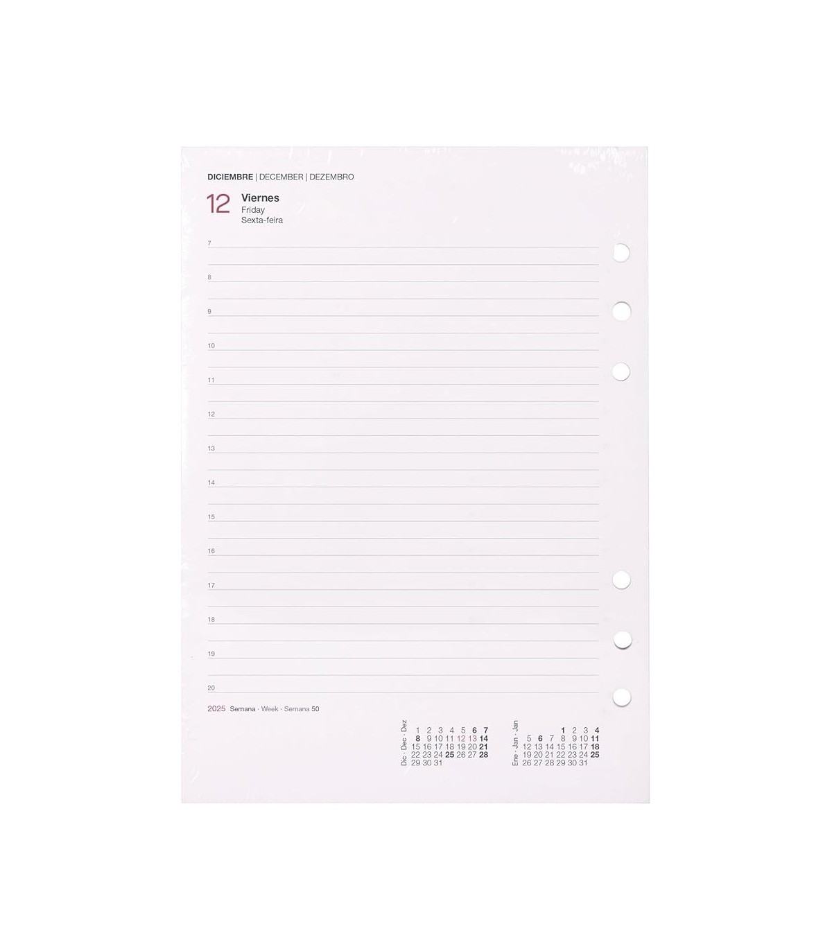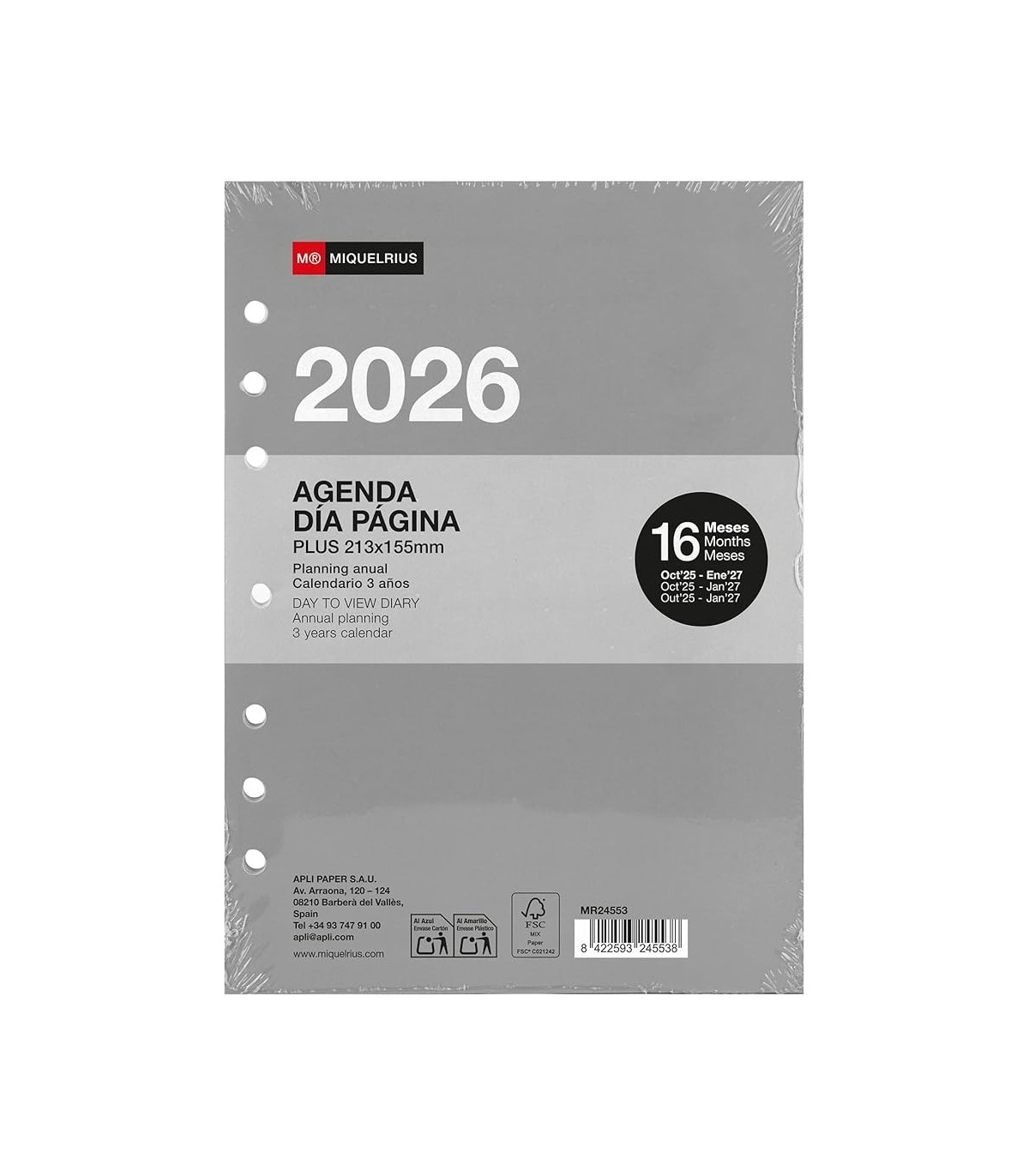 RECAMBIO AGENDA ANILLAS 2026 día por página y 16 meses (Octubre 2025 - Enero 2027). Tamaño de sobremesa: Plus 155 x 213 mm (similar A5). Idioma recambio agenda: español, inglés y portugués.