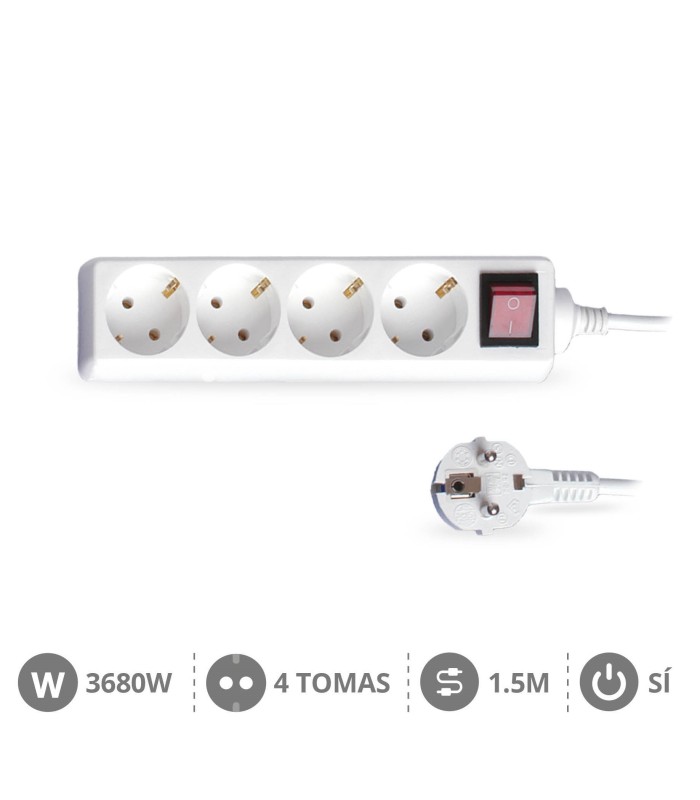 Potencia MÁX.3680W Voltaje 250V Tomas 4 TOMAS Interruptor SÍ Color BLANCO Cable eléctrico SÍ Tipo cable H05W-F Longitud cable 1.5M Sección 3X1.5MM Enchufe 2P+TT LATERAL Amperios 16A Protección niños SÍ