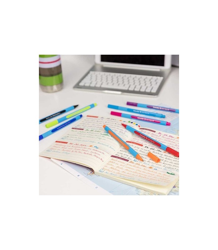 Bolígrafo con tecnología Viscoglide para una escritura extremadamente ligera con sensación deslizante. Tinta azul clara. Ancho de trazo grueso (XB). La tinta seca rápidamente también sobre papeles lisos, incluso para resaltar con un marcador. Adecuado también para dibujar y pintar por que la tinta seca rápidamente, también sobre papel absorbente. El cuerpo triangular revestido de caucho procura una postura para escribir relajadamente, evitando el cansancio de la mano. No rueda, es ideal para estuches escolares y cajones de utensilios. El capuchón es reversible. La punta de acero inoxidable resistente al desgaste garantiza el uso limpio y completo del grán depósito de tinta. El Slider Edge se fabrica sin emisiones CO2.