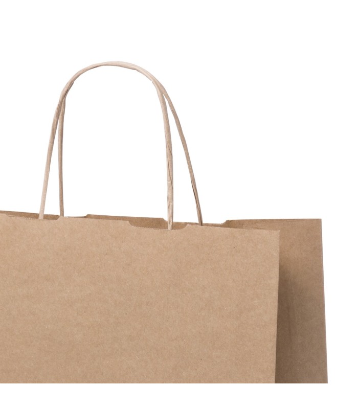 Bolsa en papel de acabado natural de 100g/m2 con asas cortas reforzadas y fuelle. Resistencia hasta 7kg de peso.