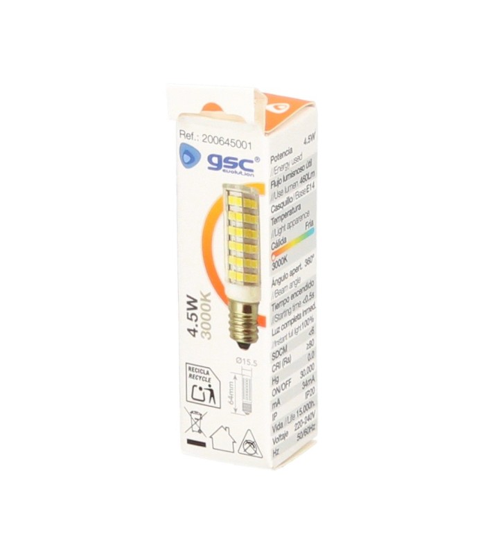 BOMBILLA LED TUBULAR GSC E14 4 5W LUZ CALIDA 3000K 460 LUMENES