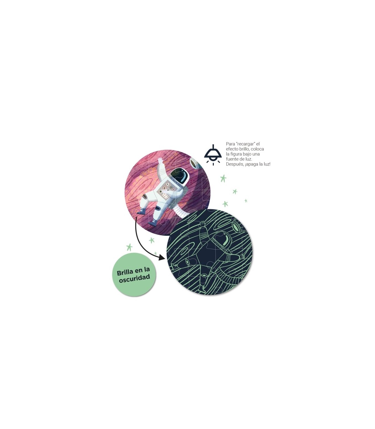 Puzzle fluorescente "Glow in the dark" con temática del Sistema Solar. Incluye 104 piezas tamaño 5 x 5 cm. Tamaño del puzzle: 64,5 x 41,5 cm. Contiene un póster a tamaño real para facilitar el montaje. Una vez el puzzle esté montado, los niños podrán apagar la luz para ver brillar los distintos planetas, estrellas y satélites del Sistema Solar. Importante: para "recargar" el efecto fluorescente, coloca el puzzle bajo una fuente de luz durante al menos media hora. Después, ¡apaga la luz para que se haga la magia! Fácil manejo para los más pequeños: piezas resistentes, seguras y fáciles de manejar. Cartón de 2 mm de grosor. Los puzzle ayudan a mejorar y desarrollar multitud de capacidades y habilidades: mejoran la concentración, la observación, la memoria y la resolución de problemas, y desarrollan la percepción espacial, la psicomotricidad fina, el reconocimiento de formas, la coordinación mano-ojo y las habilidades matemáticas. ¡El regalo ideal para los más pequeños de la casa! Recomendado para niños a partir de 5 años.