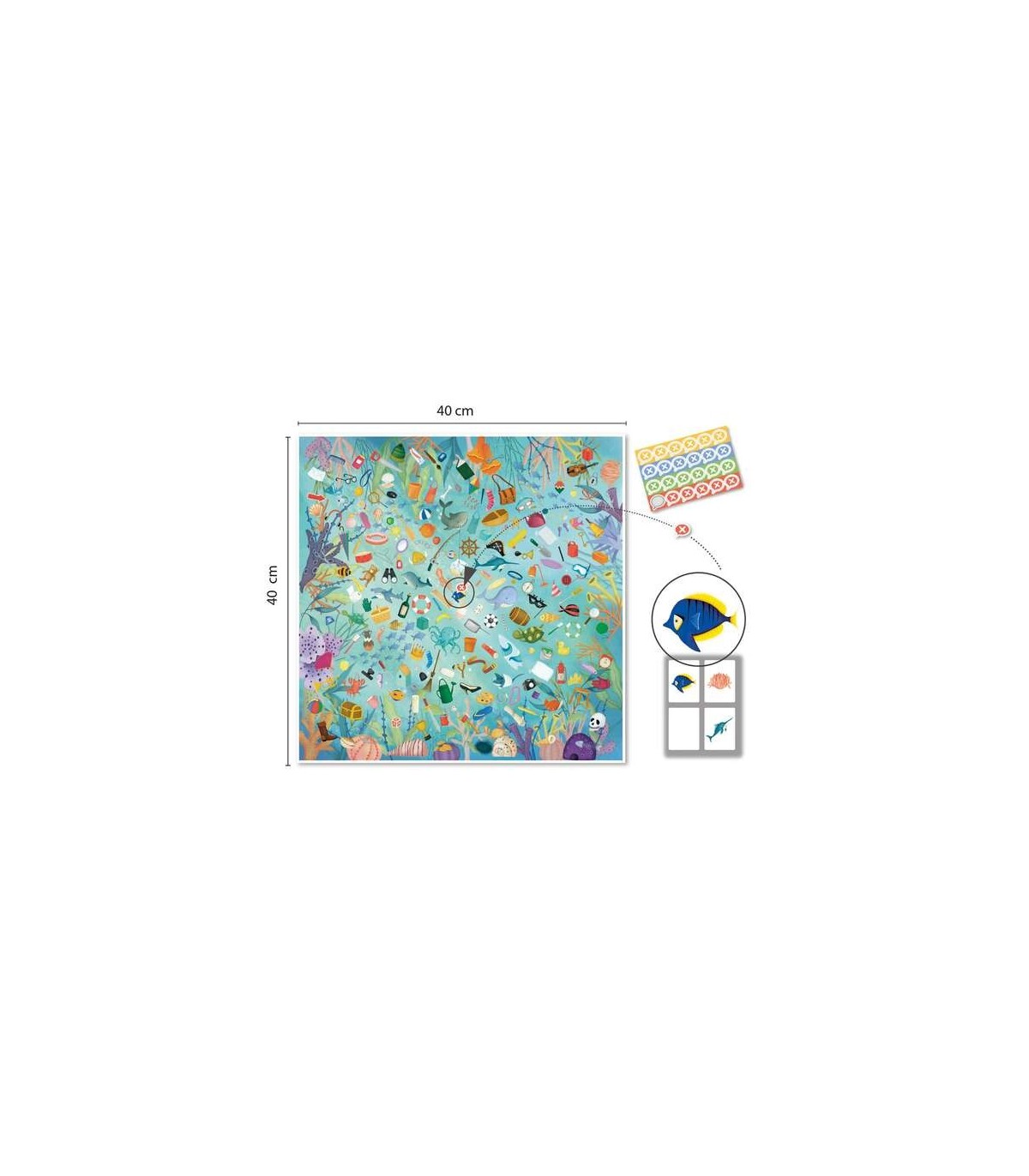 Juego de observación y velocidad Save the Ocean. Los jugadores tendrán que encontrar lo más rápido posible las 4 imágenes de su carta en el tablero para ganar.