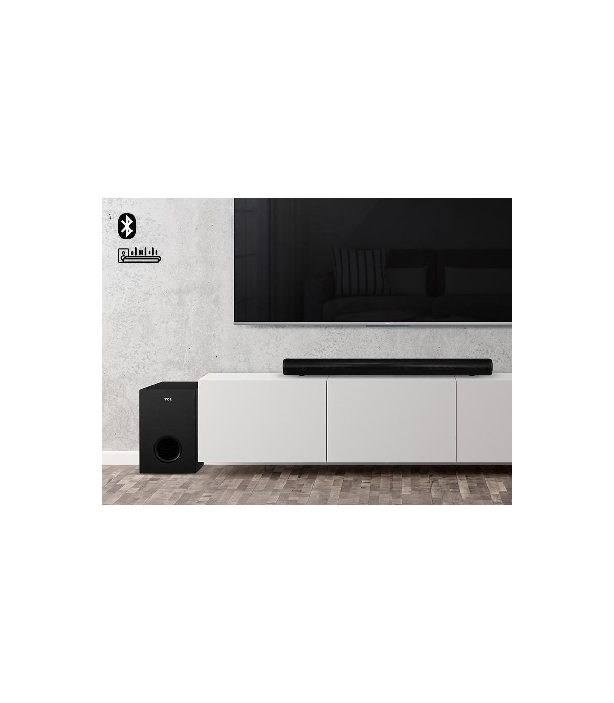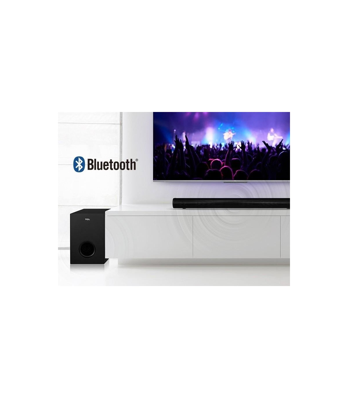 Barra de sonido TCL S522W de 2.1 canales con HDMI ARC. Gracias a la tecnología inalámbrica Bluetooth v5.1, puedes conectar tu barra de sonido al subwoofer sin necesidad de cables para experimentar unos graves increíbles. Disfrute de una experiencia de audio de alta calidad con un sonido alto y claro y unos graves profundos, en una configuración muy sencilla.