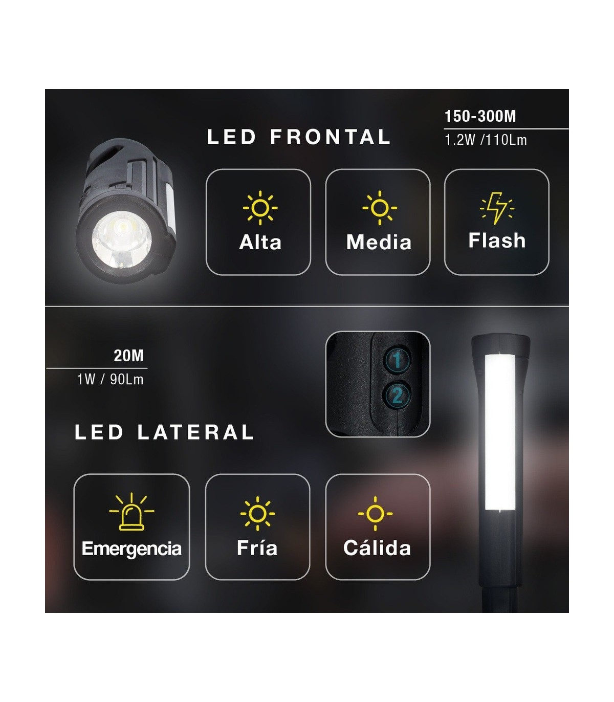 MODOS: MEDIA / ALTA / FLASH / LUZ DE LECTURA / LUZ DE EMERGENCIA