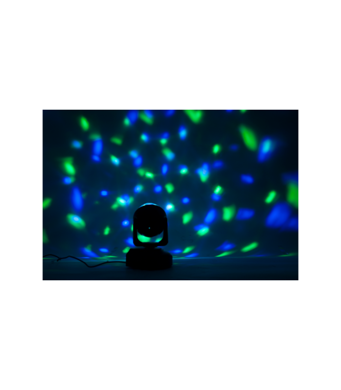 Cabeza móvil compacta que proyecta efectos luminosos multicolores en toda la sala. Puede inclinar la cabeza para dirigir los haces de luz a donde precise.