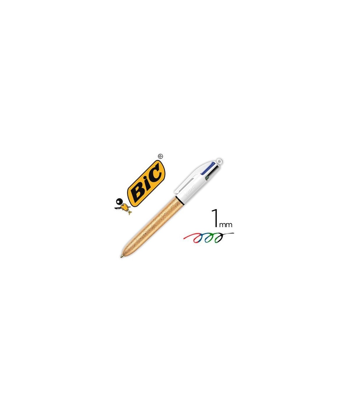 Bolígrafo retráctil con 4 colores en 1 (rojo, azul, verde y negro). Tinta de aceite. Con trazo de 0,4 mm. Punta de 1 mm. Permite corregir, marcar o diferenciar un texto con solo pulsar el color de tinta elegido. Sistema para correa. Con cuerpo y clip de plástico. El cuerpo es de color oro con trazos brillantes tipo purpurina. EDICION 50 ANIVERSARIO