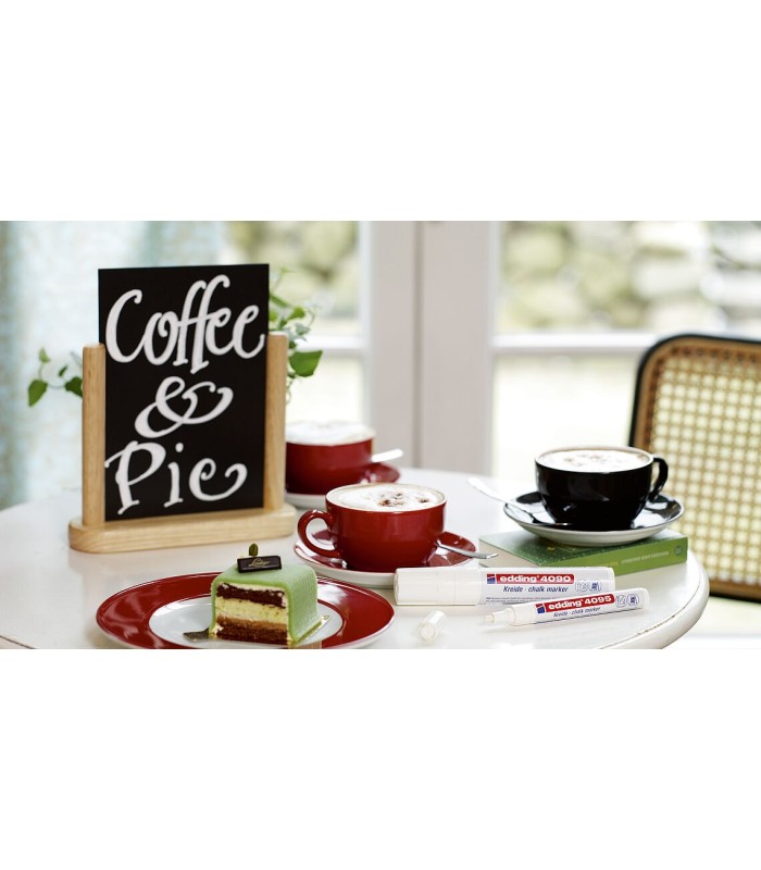 Los colores permanecen nítidos sobre la superficie y, no obstante, se pueden limpiar fácilmente con un paño húmedo. Con una amplia gama de colores, el marcador de tiza edding 4090 es tan versátil como diversos son sus usos.
